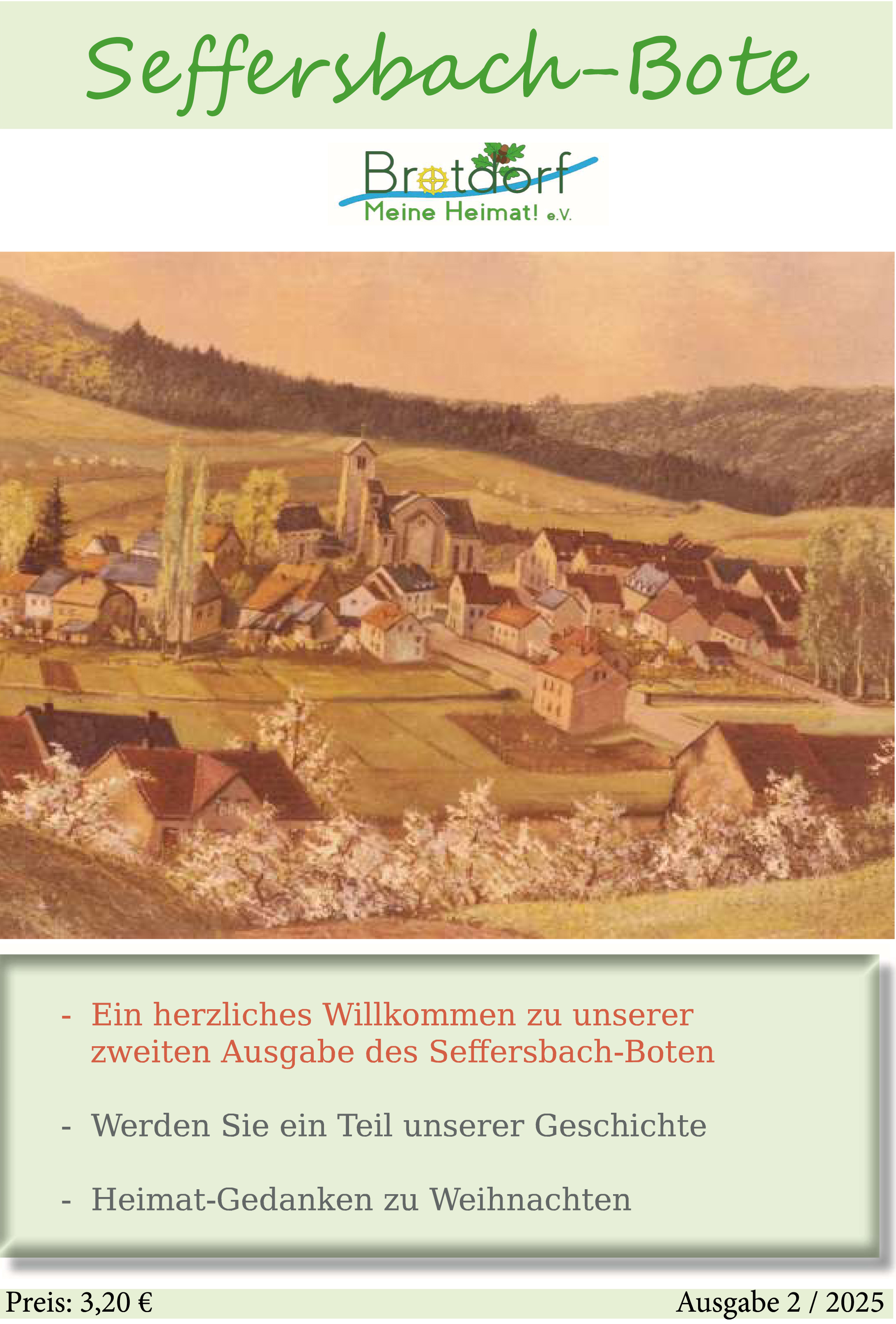 Der Seffersbach-Bote meldet sich zurück! – Unsere zweite Ausgabe erwartet Sie! Liebe Brotdorferinnen und Brotdorfer, liebe Freunde der Heimatgeschichte, es ist soweit: Die mit Spannung erwartete zweite Ausgabe unseres „Seffersbach-Boten“ ist fertig und wartet darauf, von Ihnen entdeckt zu werden! Freuen Sie sich auf neue, faszinierende Geschichten, historische Bilder und interessante Beiträge rund um unser geliebtes Brotdorf. Markieren Sie sich diese Termine, um Ihr Exemplar zu sichern: